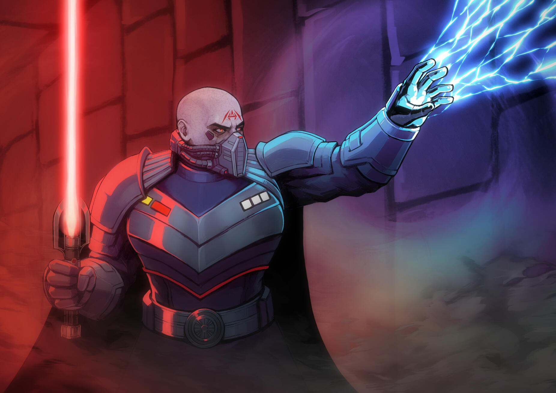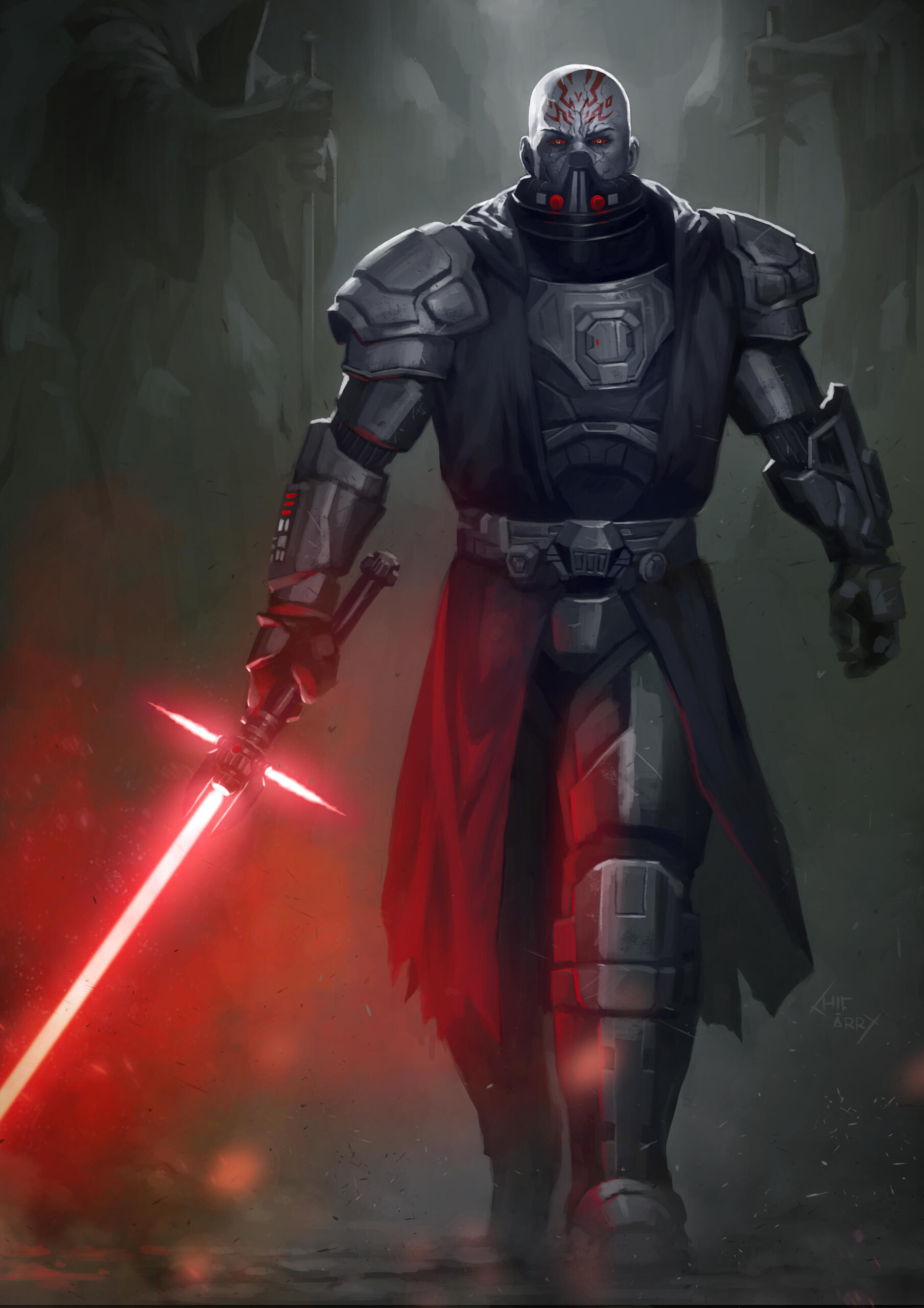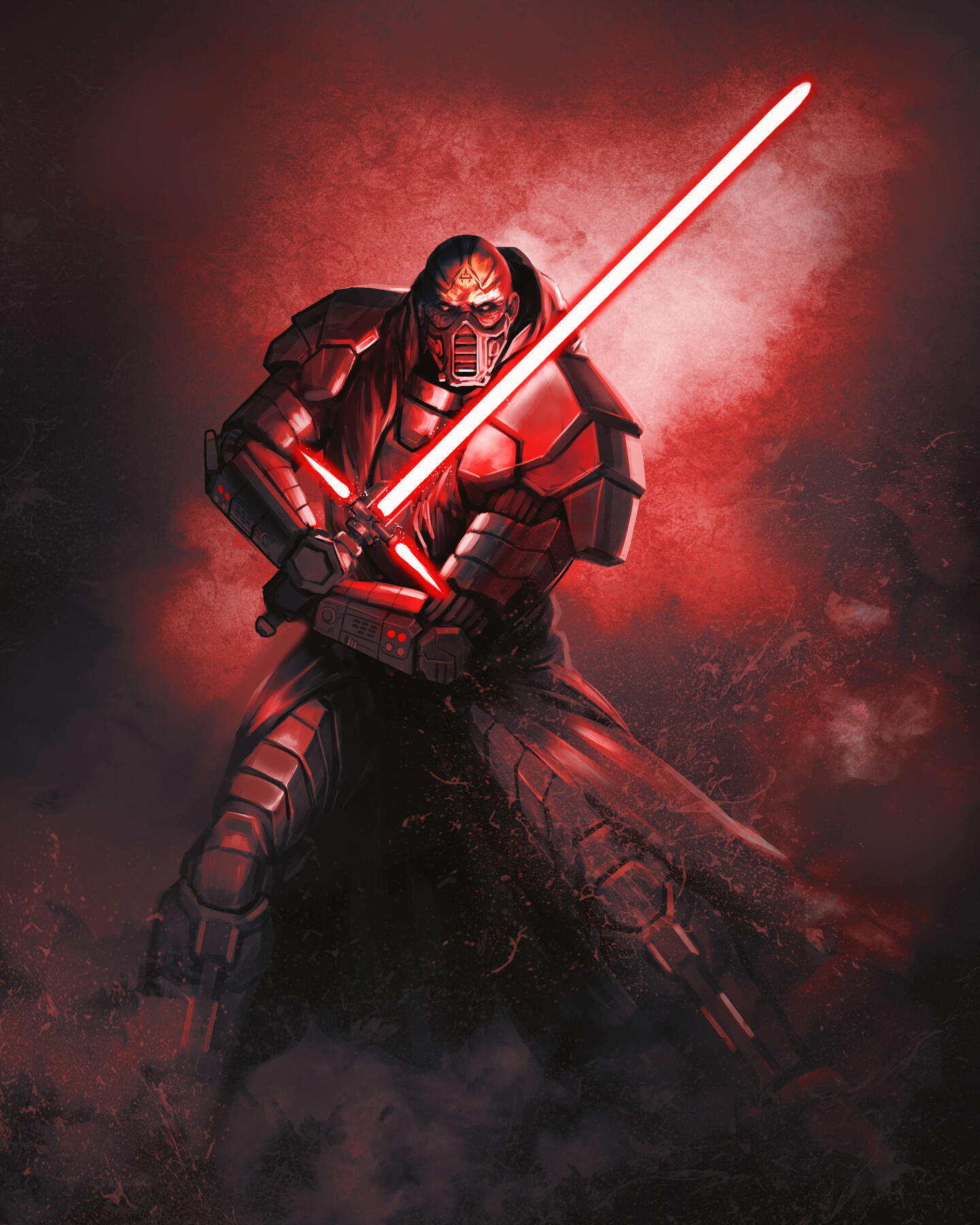 Titanic is the best word to describe the first impression most people would have for the Epicanthix. Imperius stands at two meters and twenty-five centimers tall, heavily built with muscles. His rather pure physical presence is amplified by a dark plate armour, mended and yet scarred from battles uncounted, a seemingly crude and yet masterfully crafted piece of protection which has accompanied him through many battles and duels.Only the upper half of his face is ever visible, the lower concealed behind a respirator unit. What is visible is dominated by the effects of the Dark side. Sickly, corrupted skin, cracked and woven with veins, bloodshot eyes burning with red fire and intricate red tattoos which run along his shaven scalp.Imperius' voice is remarkably clear and extraordinary in its way of delivering his determination and conviction, it is powerful and reaches everyone it is meant to. There is no doubt, no hesitation in his tone, yet there is no arrogance or hint of screaming.Those attuned to the Force will immediately notice his presence. He is not hiding it, or attempting to, he carries it with the same conviction as his voice carries effortlessly across a battlefield. Imagine a light, so pure that it can burn out your eyes with its serene and flawless purity - now reverse it. A black hole, the pull of its temptations of power so strong, its emotions running so hot into a bottomless abyss of hate, wrath and ruthless ambition.