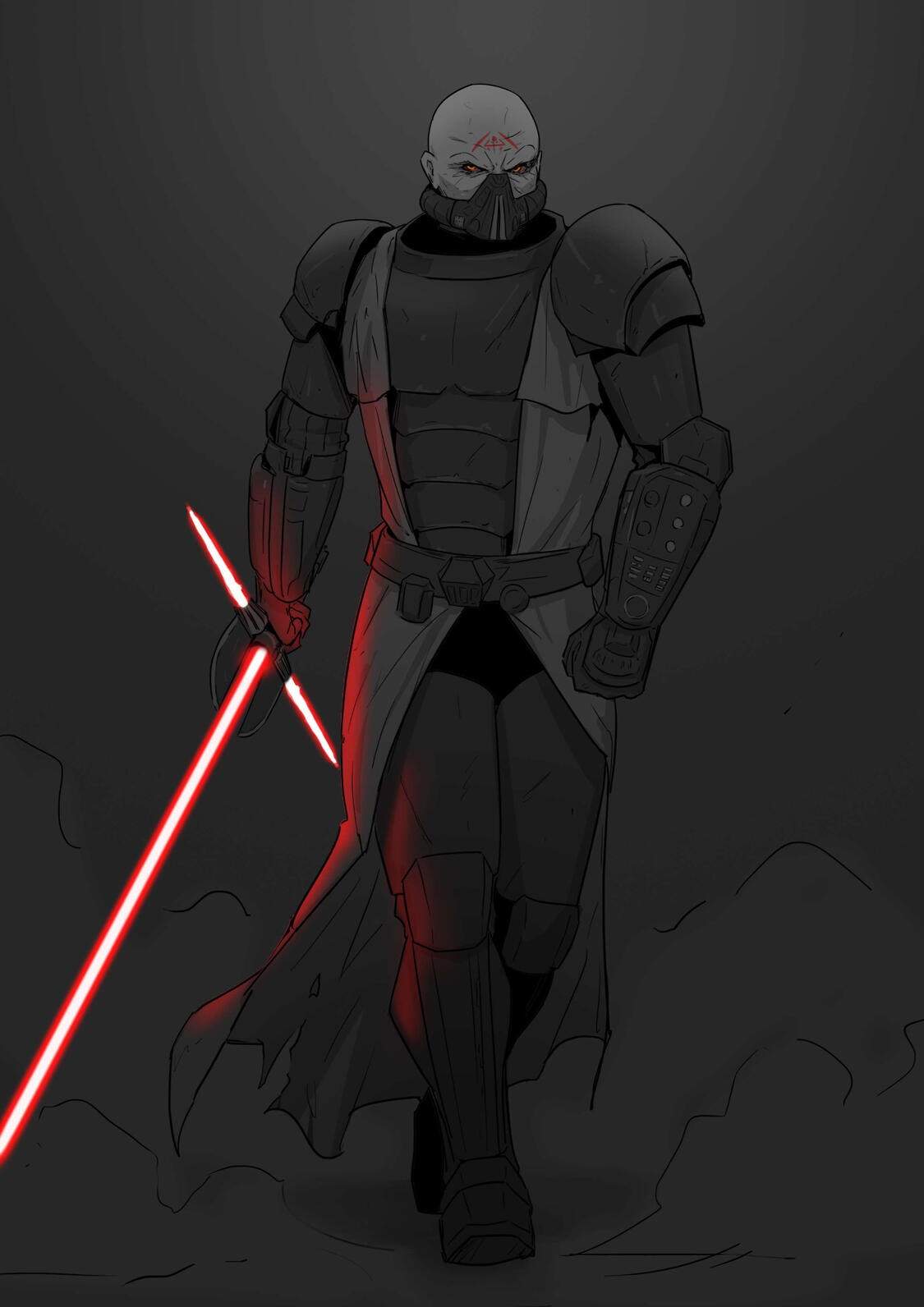 Titanic is the best word to describe the first impression most people would have for the Epicanthix. Imperius stands at two meters and twenty-five centimers tall, heavily built with muscles. His rather pure physical presence is amplified by a dark plate armour, mended and yet scarred from battles uncounted, a seemingly crude and yet masterfully crafted piece of protection which has accompanied him through many battles and duels.Only the upper half of his face is ever visible, the lower concealed behind a respirator unit. What is visible is dominated by the effects of the Dark side. Sickly, corrupted skin, cracked and woven with veins, bloodshot eyes burning with red fire and intricate red tattoos which run along his shaven scalp.Imperius' voice is remarkably clear and extraordinary in its way of delivering his determination and conviction, it is powerful and reaches everyone it is meant to. There is no doubt, no hesitation in his tone, yet there is no arrogance or hint of screaming.Those attuned to the Force will immediately notice his presence. He is not hiding it, or attempting to, he carries it with the same conviction as his voice carries effortlessly across a battlefield. Imagine a light, so pure that it can burn out your eyes with its serene and flawless purity - now reverse it. A black hole, the pull of its temptations of power so strong, its emotions running so hot into a bottomless abyss of hate, wrath and ruthless ambition.